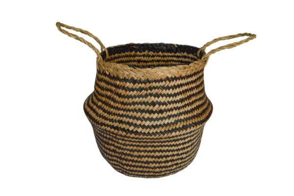 Cesta artesanal com duas alças de junco marinho. Na cor natural e com listras pretas por toda parte.