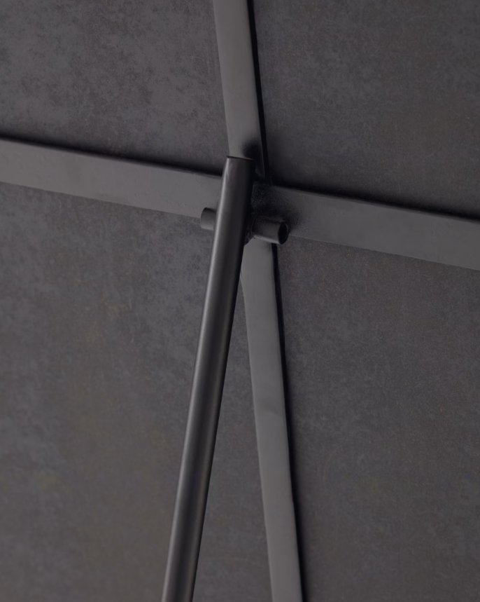 Espelho de pé feito com aço de acabamento preto.
